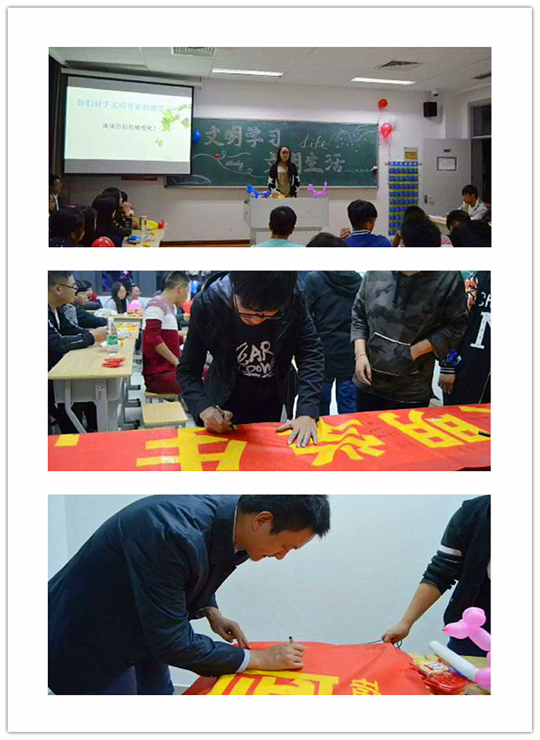 为了营造校园良好氛围,10月26日晚7点,Bevictor伟德官网16统计2班在教学楼A1504首次展开了以“文明学习,文明生活”为主题的团日活动。本次晚会邀请了班主任王坤老师,班助赵春怡和范心玮,员工会主席费梓轩和许婷,副主席柴航,团活部部长马佳慧,文娱部部长李彤等学长学姐。首先由三位同学张驰,孙彦辰和徐杰以搞笑的方式入场,拉开了活动的序幕,他们和台下同学互动唱歌,瞬间点燃了全场的热情。紧接着主持人毛尚宁同学展开了关于文明的座谈会,同学们积极的配合并踊跃发言。接下来是柴航学长的祝词和马佳慧学姐对文明的理解以及她遇到的不文明事件,同学们也纷纷发表了自己的想法。然后孟科学长为大家吹了一首《大鱼》,令所有人都陶醉。最后是参加活动的每位人员在标语上签名并拍照留念,此次团日活动圆满结束。此次班会不仅使文明礼貌的观念深入人心,同时为进一步全面提高老员工综合素质,推动公司素质教育工作的深入开展打下坚实的基础。