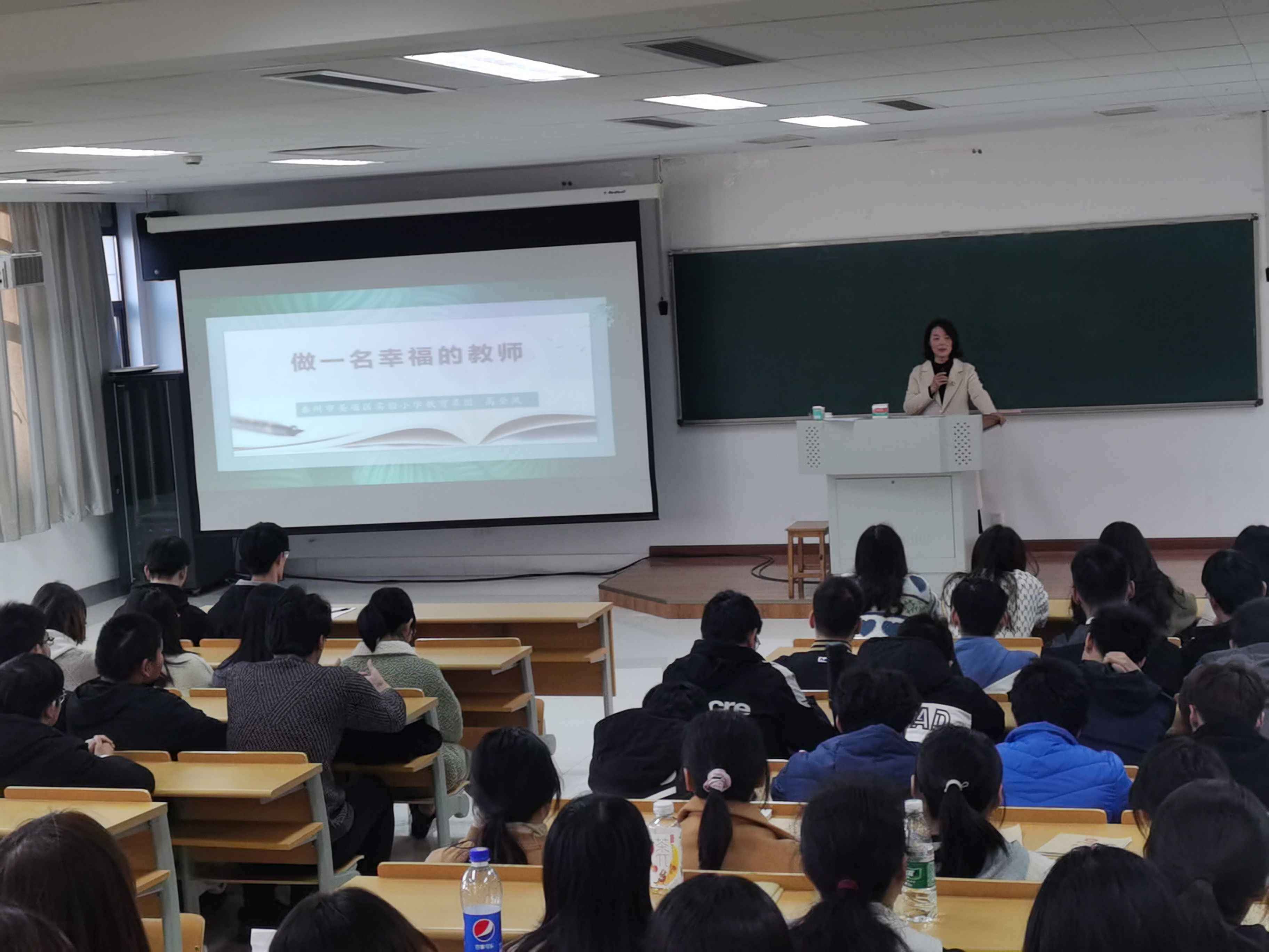 高董事长从“做一名幸福的教师”这一俗常而又不失诗意的话题展开,结合个人的从教经历和感悟,就“什么是教师的幸福”“教师的幸福在哪里”“幸福教师的特质”三个方面与同学们进行了分享与交流,认为教师的幸福是一种热爱,是一种成长,是一种守望,要成长为一名优秀的教师要“坚持、努力、钻研和思考”,还结合具体的教学案例分析了应如何巧设情境,并勉励大家要苦练教学基本功,积极参加各种教学竞赛。