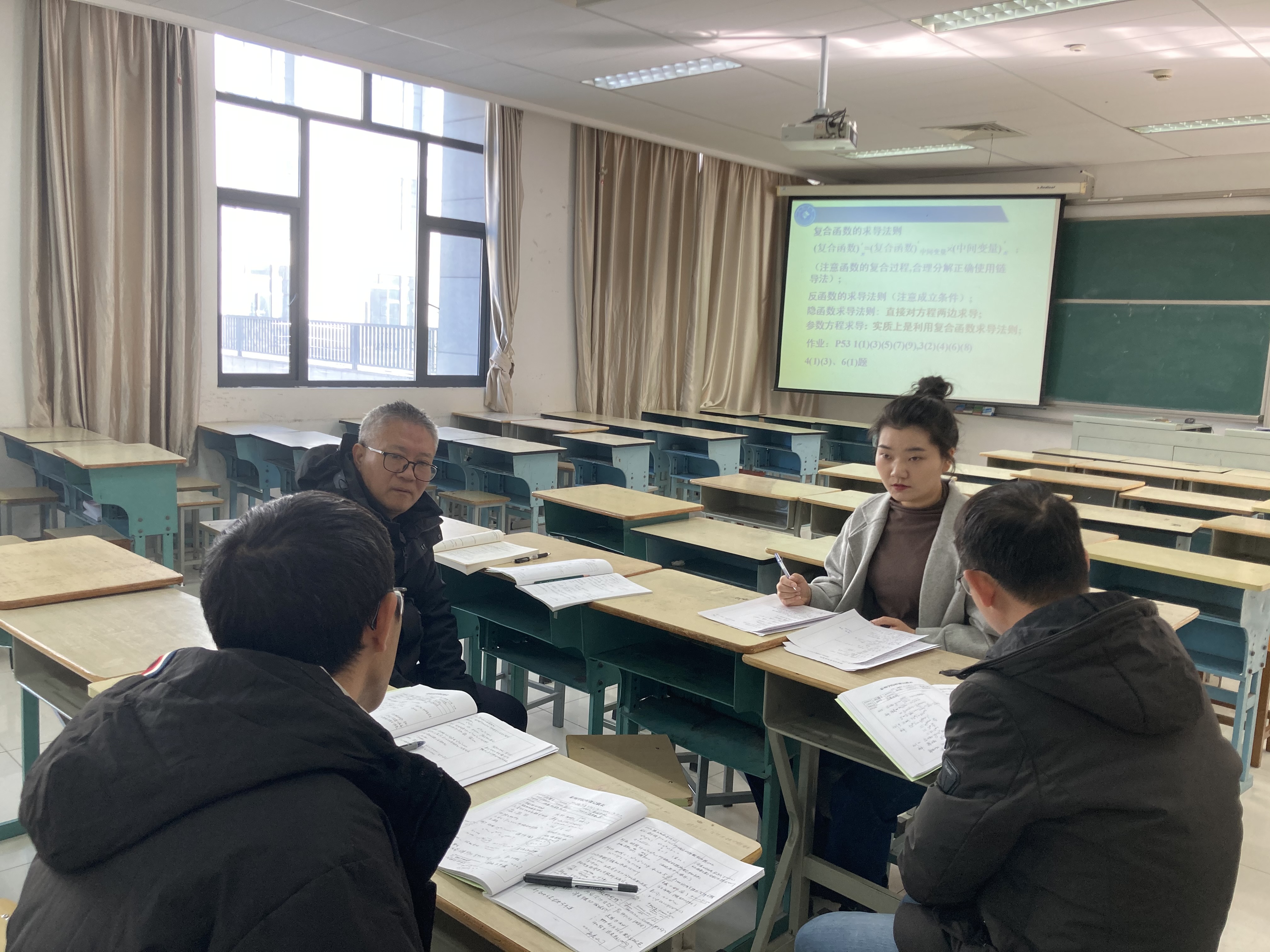 督查过程中,大家分别听了刘攀文老师的《高等数学B1》和孙倩倩老师的《高等数学A1》。课后杨书记首先充分肯定了两位教师备课认真、课件制作精良,授课内容熟练,表达流畅,讲解清晰,接着他与任课教师就课堂教学组织、教学方法、教学内容等方面进行了交流。