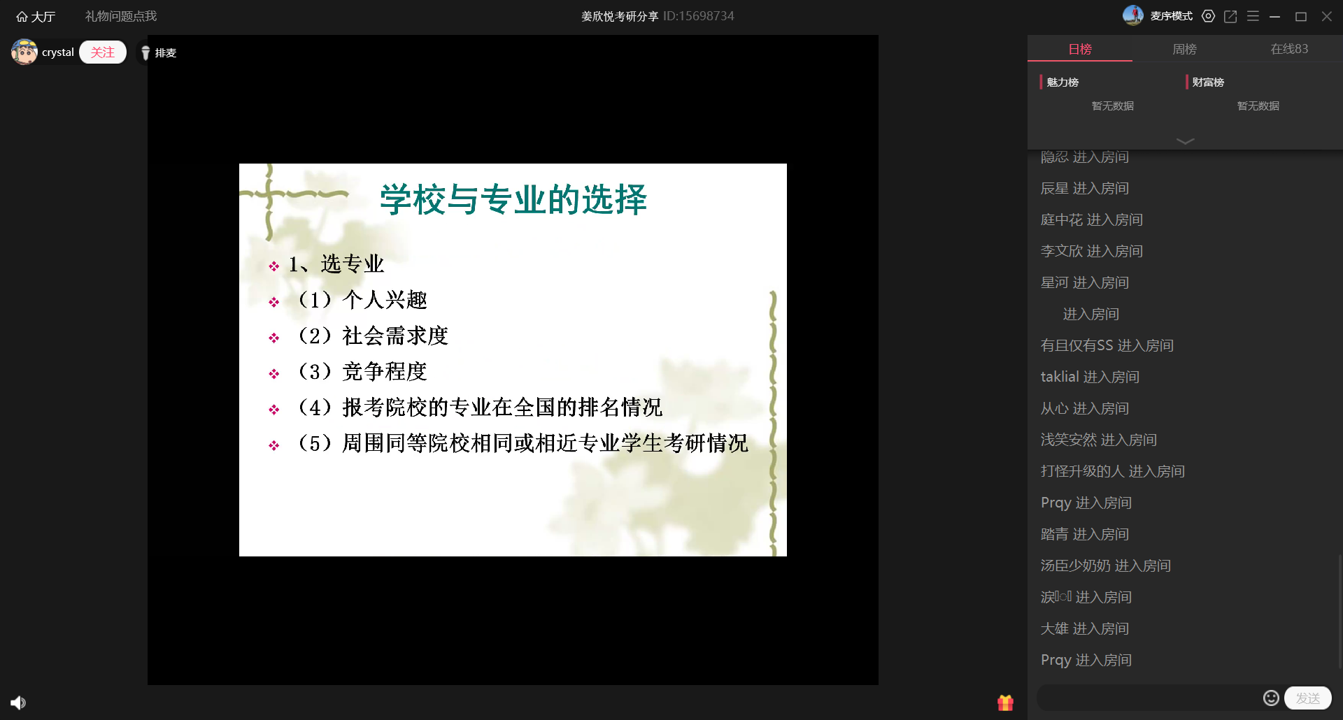 “勤奋有创造性地学习才能越重山,跨峻岭。”姜欣悦同学就怎么复习、怎么选择公司,以及公司与专业的选择等问题与大家分享考研经验与心得。首先,制定学习计划,按照计划脚踏实地,贵在坚持;对于怎么选择公司,她认为要从自身出发,适合自己的才是最好的;关于公司与专业的选择,她提出“实事求是,量力而行”两个原则;最后,姜欣悦同学结合自身经验,为准备考研的学弟学妹答疑解惑。