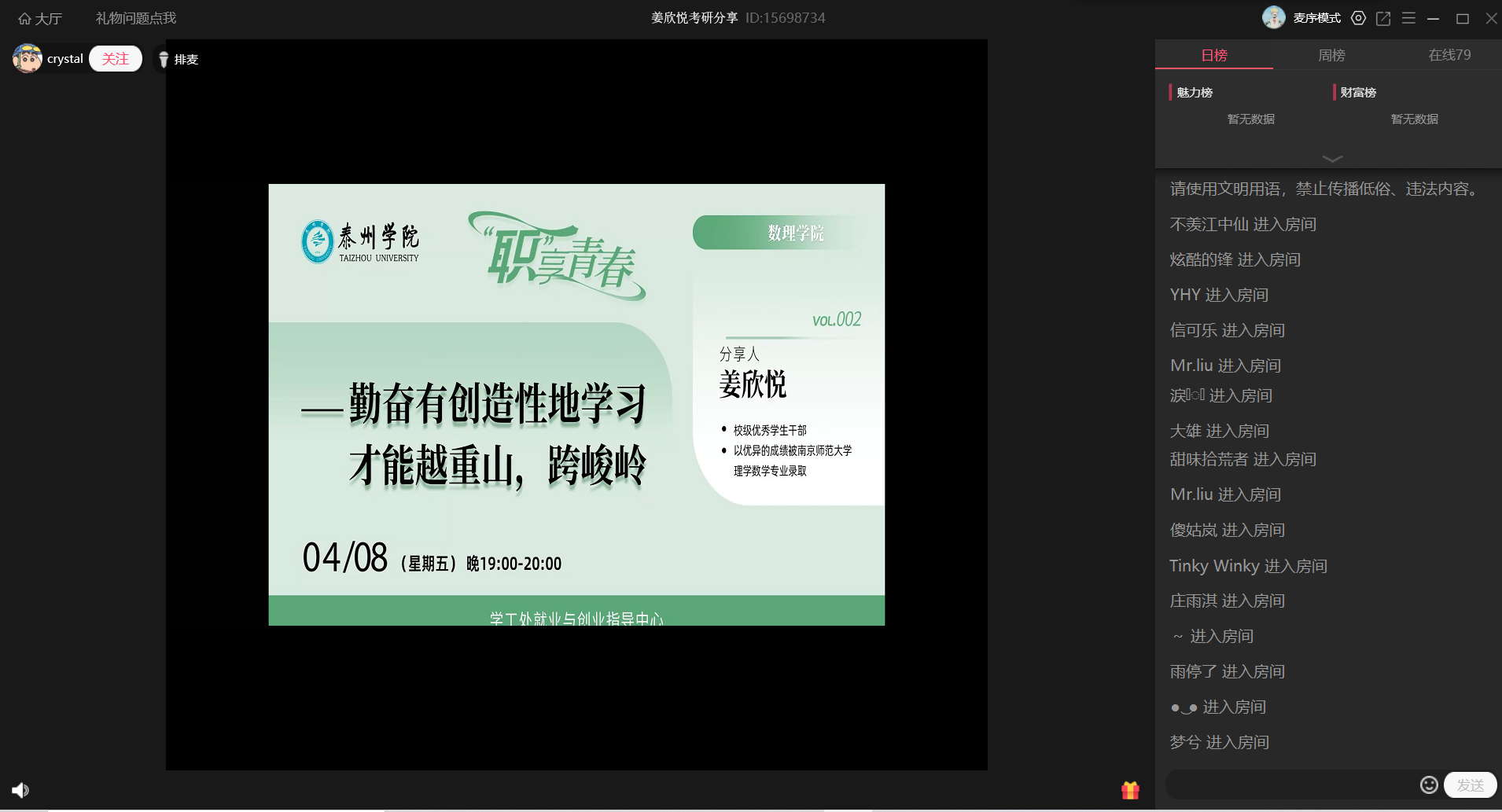 4月8日19点,公司举办考研经验分享交流会。此次交流会邀请了以优异成绩被南京师范大学理学数学专业录取的18级数学与应用数学(师范)专业姜欣悦同学,辅导员赵洁、2019级和2020级部分同学参加了本次分享会。