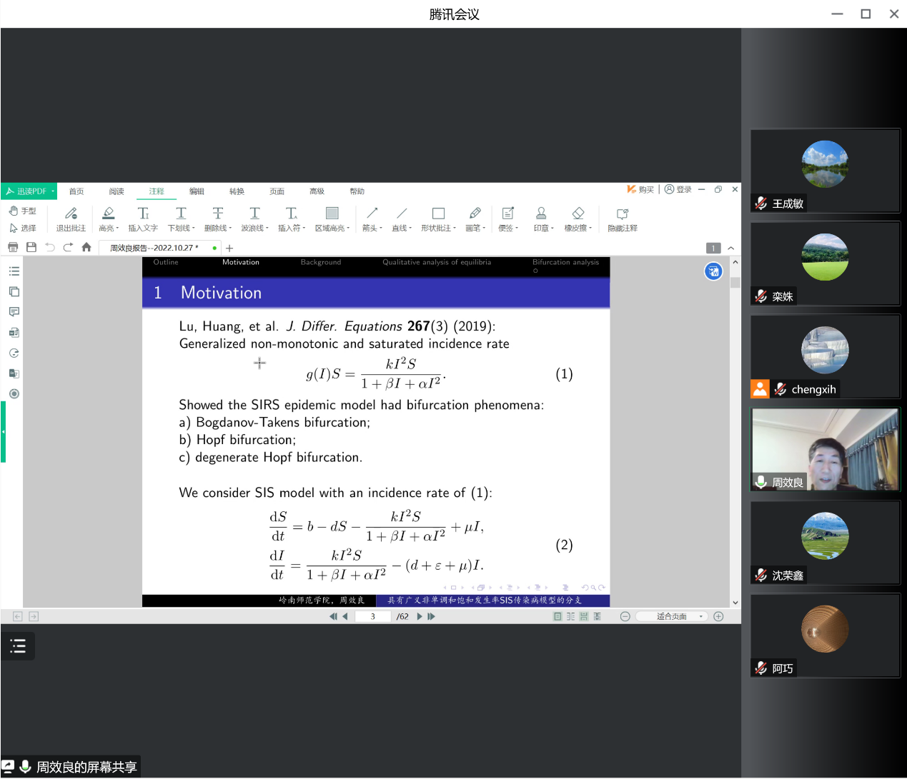 栾姝教授报告的题目为“多解 p-Laplacian 椭圆型偏微分方程的最优控制问题”。在报告中,栾教授介绍了多解椭圆型偏微分方程最优控制问题的背景,研究现状及最新进展,重点关注状态方程为多解 p-Laplacian 椭圆型偏微分方程的情形。周效良教授报告的题目为“具有广义非单调和饱和发生率传染病模型的分支”。在报告中,周教授将广义非单调和饱和发病率引入到SIS流行模型中,以解释易感人群心理行为引起的抑制效应和拥挤效应,揭示了易感人群的心理行为对疾病传播的影响。报告结束后,与会师生与两位专家就相关问题进行了深入地交流和讨论。