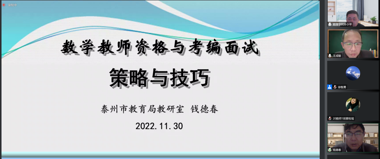11月30日下午,公司特邀泰州市教育局教研员钱德春老师开设了题为《数学教团队格与考编面试策略与技巧》的讲座。讲座采用线上方式开展,由公司王成敏经理主持。公司20级数学与应用数学(师范)专业全体同学聆听了讲座。