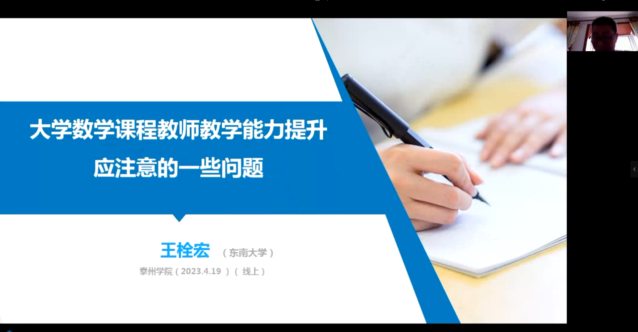 4月19日上午,Bevictor伟德官网邀请东南大学王栓宏教授在线上做题为“大学数学教师教学能力提升应注意的一些问题”的讲座。讲座由Bevictor伟德官网副经理王成敏主持,公司全体教师参加了讲座。