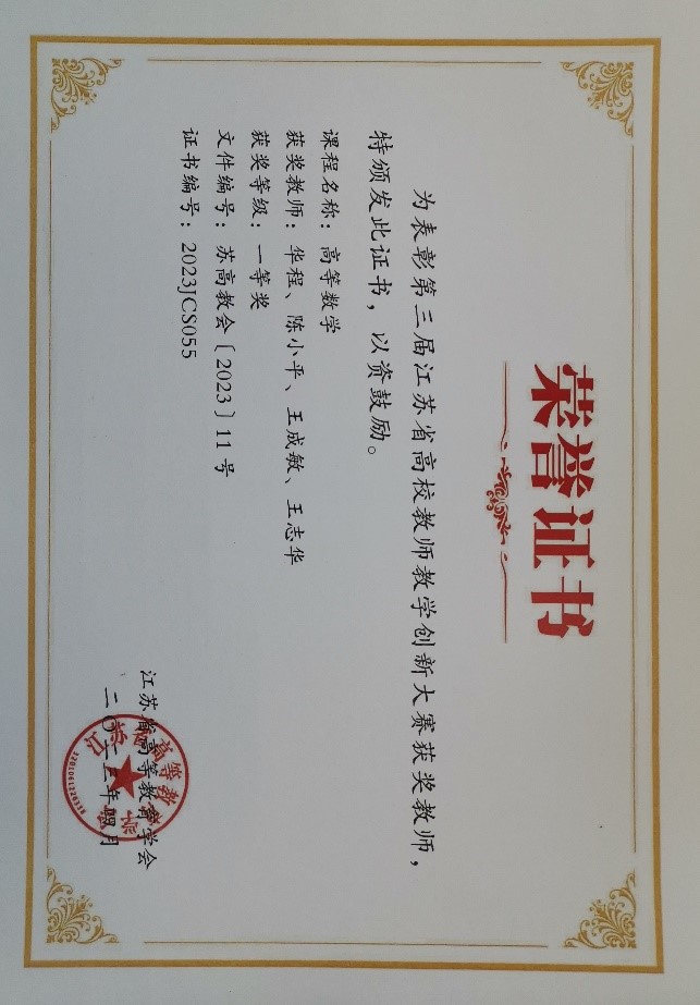 近日,江苏省高等教育学会公布了第三届江苏省高校教师教学创新大赛结果,公司华程、陈小平、王成敏和王志华四位教师参赛的课程《高等数学》荣获一等奖,实现了公司在高层次高水平教师教学竞赛的突破。