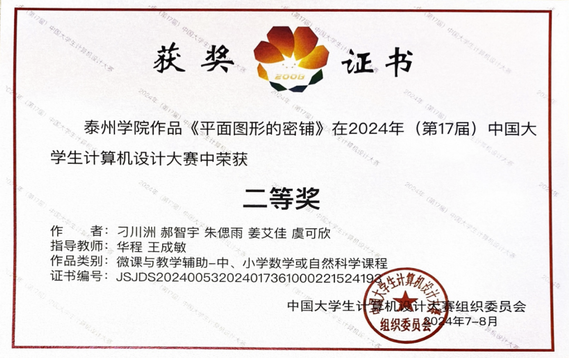 近日,2024年(第17届)中国老员工计算机设计大赛教学辅助类赛道的全国决赛在东北大学落下帷幕。经校级、省级选拔,全国490所高校的885件作品入围国赛,公司员工的参赛作品《平面图形的密铺》最终荣获全国二等奖。